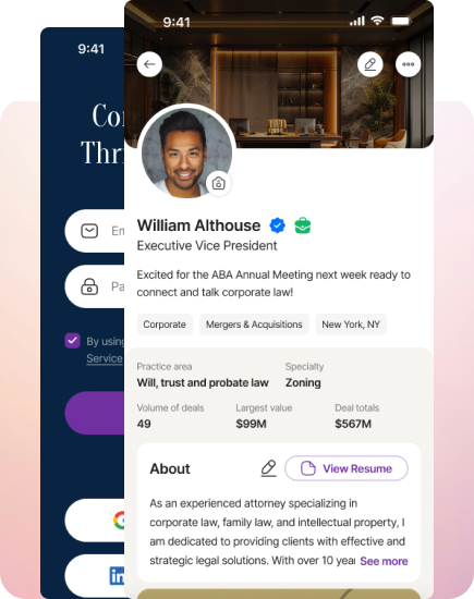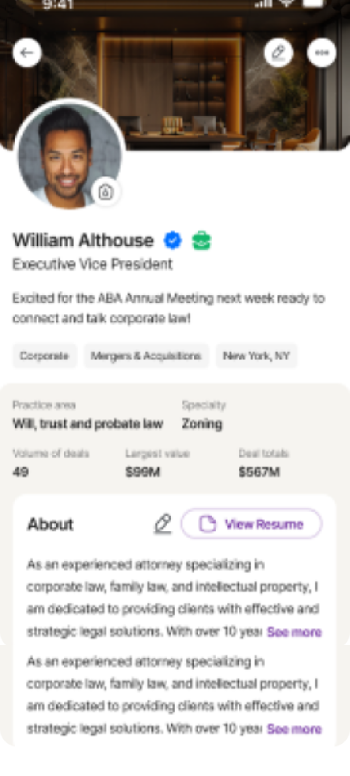 Esqone is where attorneys don’t just network — they build visibility, reputation, and referrals. Your profile becomes a dynamic portfolio of your work, indexed so clients and colleagues can find you.